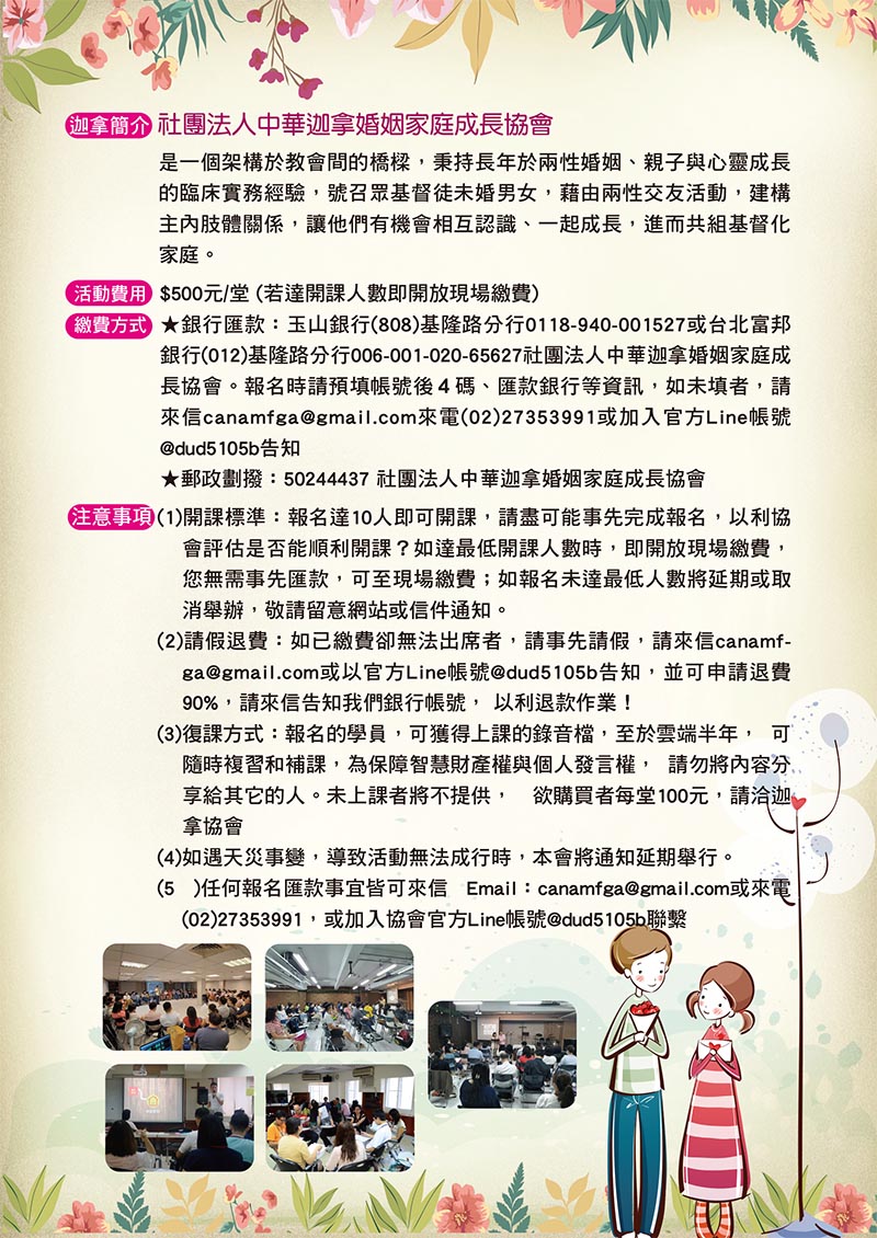 個別婚前輔導 請電洽迦拿協會(02)27353991