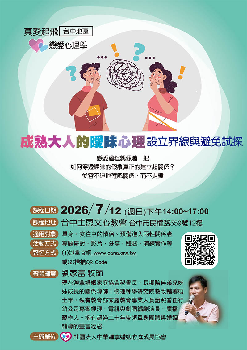 個別婚前輔導 請電洽迦拿協會(02)27353991