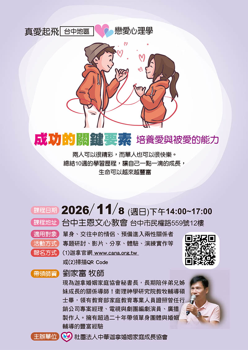 個別婚前輔導 請電洽迦拿協會(02)27353991
